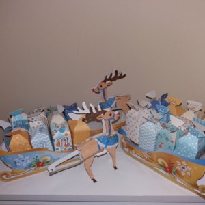Belefértek pl. a dobókockák, a mágnesek, és persze a csokigolyók, és pár matrica. A sütikiszúrók már pont nem. Így a vége az lett, hogy a legtöbb dobozban mégis csoki landolt. Az állandóan szétesős vagonokat, szánkókat, és szarvasokat a ragasztópisztoly segítségével orvosoltam (illetve elégettem vele a kezemet, és tönkretettem egy farmert, amikor rácsöpögött a ragasztó), aztán mehettek bele a kis dobozkák. Amikor kész lett a nagy mű, az alvó dedek szobájába beállítottuk őket, hogy reggel legyen nagy öröm.